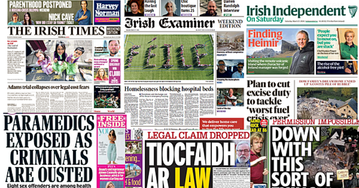 The Irish Times led with the trial of Gerry Adams collapsing after the judge raised the possibility of Jonathan Ganesh, Barry Laycock and John Clark footing a bill totalling hundreds of thousands of pounds in Adams’s legal costs if they lost.