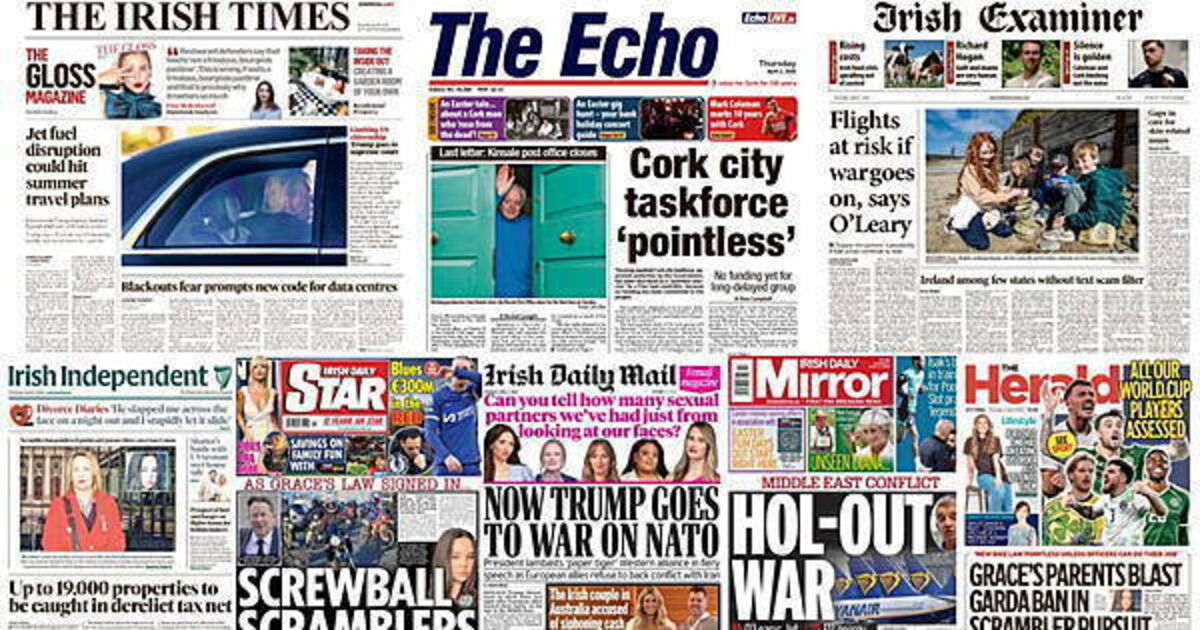 The Irish Daily Mail leads with Donald Trump threatening to ditch Nato on Wednesday night after European allies turned their backs on his war in the Middle East.