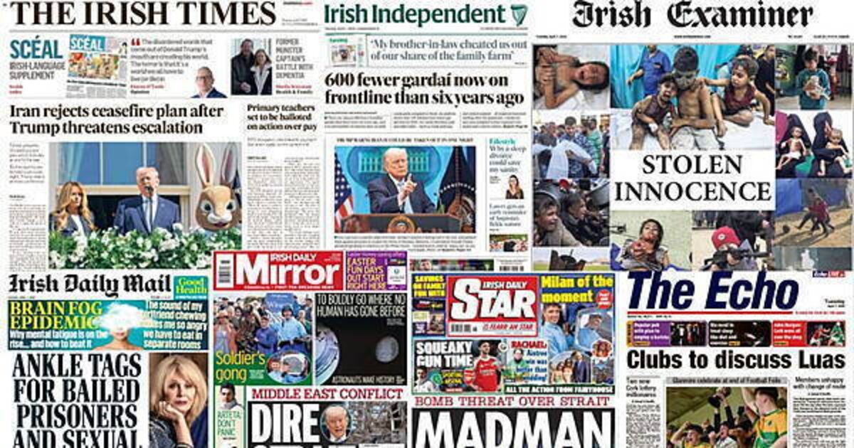 The Irish Times, Irish Daily Mirror, and Irish Daily Star all lead with the conflict in the Middle East as US President Donald Trump threatens escalation after Iran rejected a ceasefire plan.