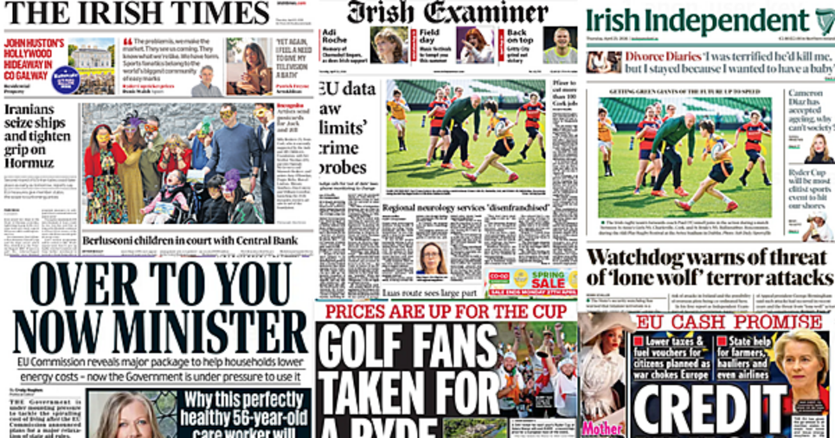 The Irish Times leads with Iran seizing two ships in the Strait of Hormuz, tightening its grip on the strait, amid reports