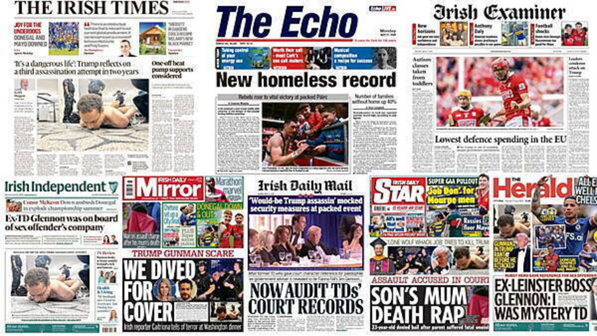 The Irish Daily Mirror leads with former RTÉ presetner Caitriona Perry saying she dived for cover when a gunman opened fire at a dinner attended by US president Donald Trump.