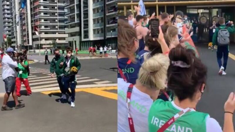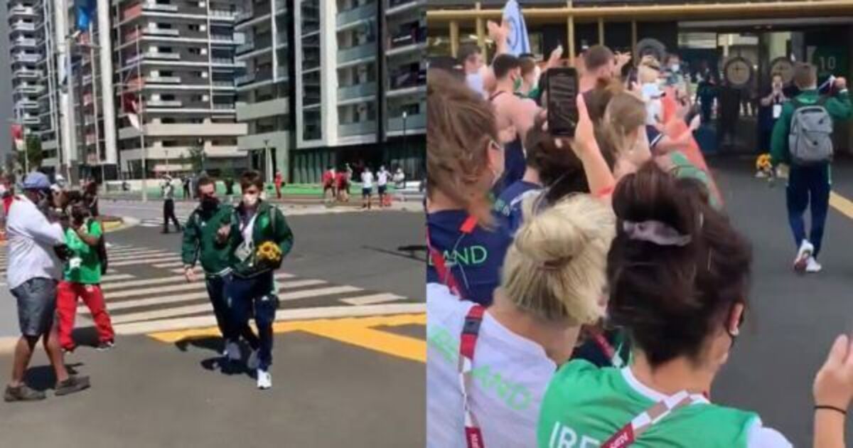 The welcome and love for @TeamIreland rowing gold medallists Fintan McCarthy and Paul O’Donovan as they return to the Olympic village pic.twitter.com/UaXU2ivwLl