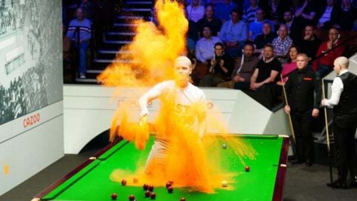 A man wearing a ‘Just Stop Oil’ T-shirt interrupted the match between Robert Milkins and Joe Perry on Monday evening by jumping on to one of the tables and tipping orange powder over the cloth.