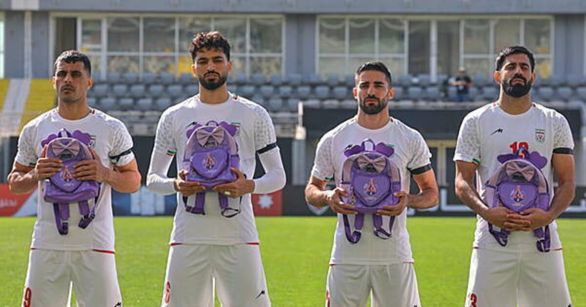 Iran wear black armbands and hold schoolbags during national anthem before match