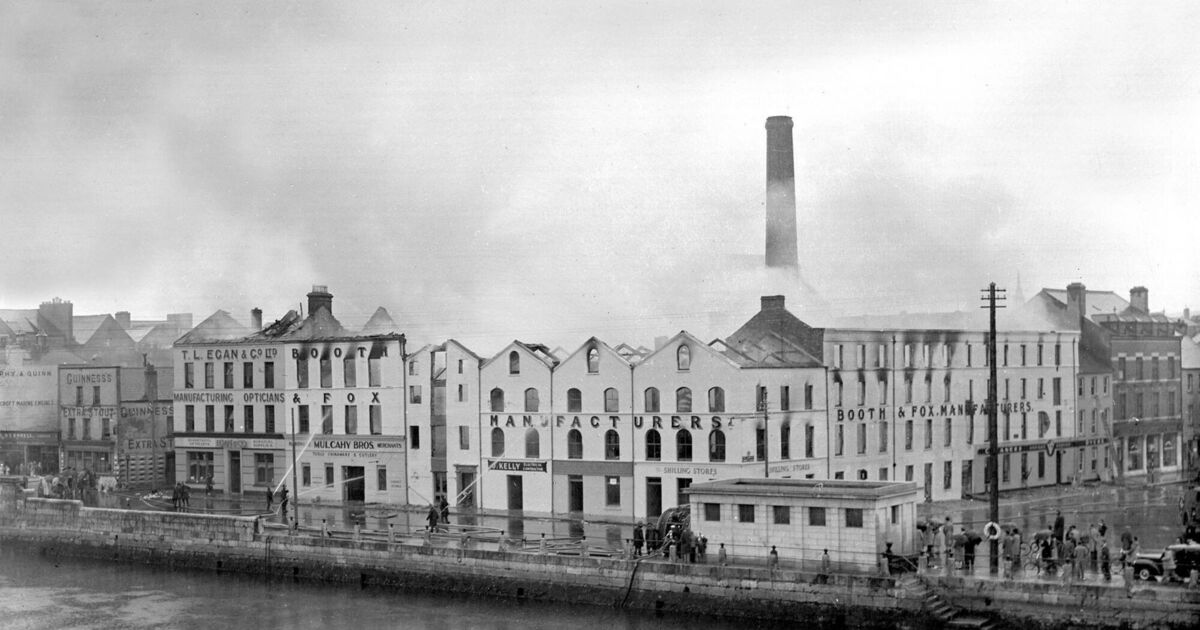 Now, as ‘Jack’ Crowley, with his two fire engines and ten firefighters, pulled up on Lavitt’s Quay, a daunting task lay before them. As well as Booth and Fox’s, the Shilling Stores, V. P. Ltd (dyers and cleaners), T. A. Sutton (saddlers), J. A. Kelly, (electricians), Mulcahy Bros (chandlers and hardware merchants) and T. L. Egan and Co (surgical requisites and optical manufacturers) were all involved.