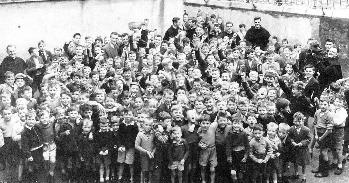 Gus Harrington, Mick Archer, and Denis Philpott show the All Ireland Minor Cup to the children at South Monastery School in 1961. A former pupil recalls his time there in today’s Throwback Thursday