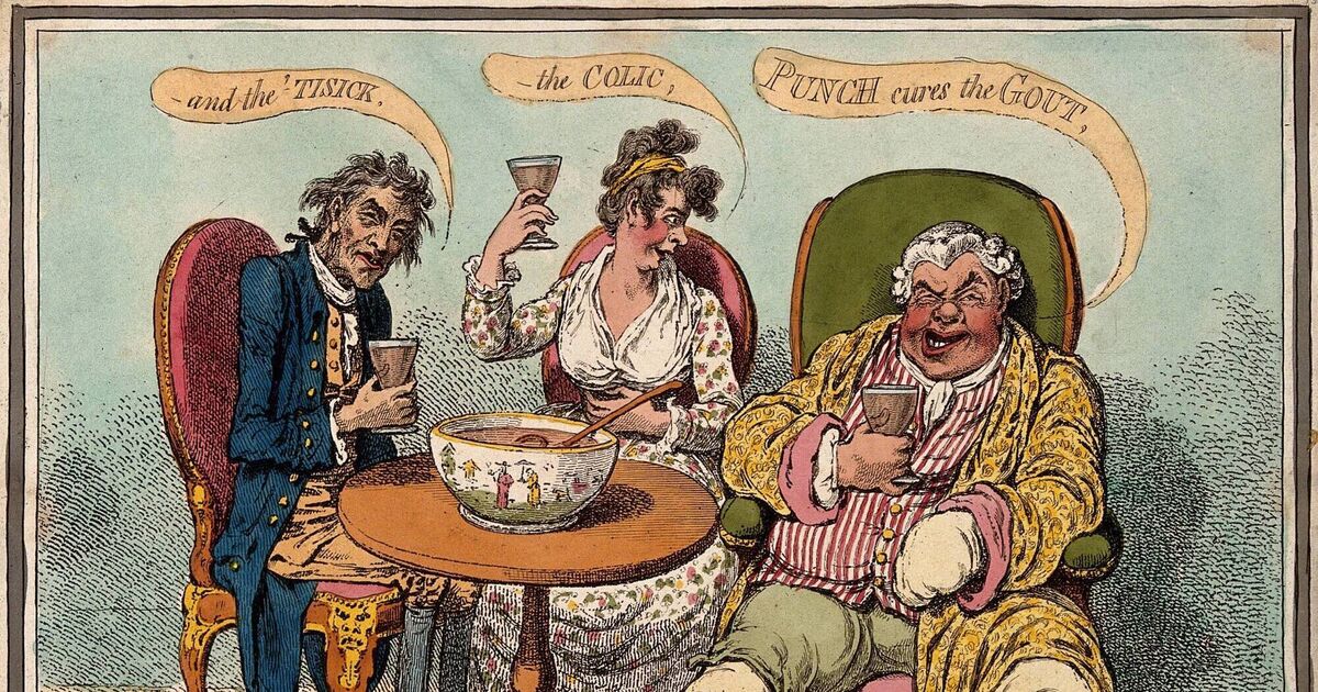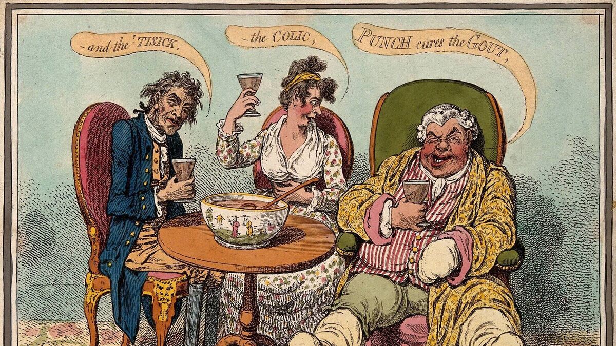 A cartoon by 17th century British caricaturist James Gillray as people drink punch to treat phthisis (tuberculosis), colic, and gout.
