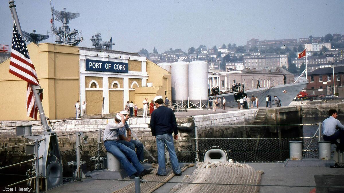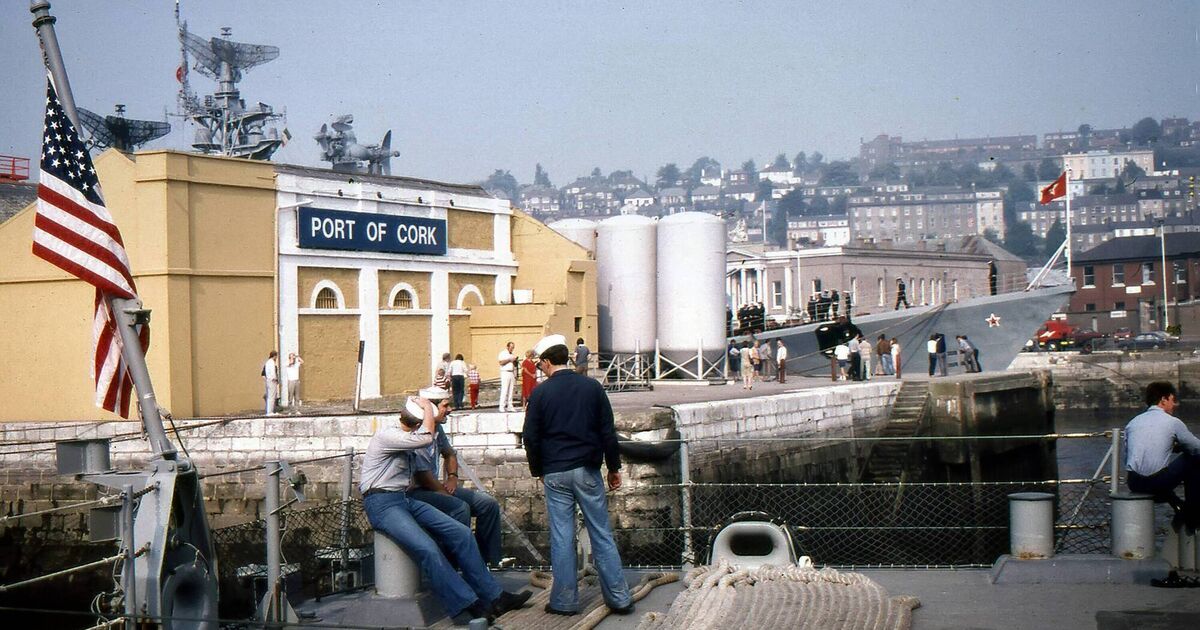 SUPERPOWER STAND-OFF: American sailors on the USS Pharris in the foreground in Cork Harbour in September, 1985, with the Stars and Stripes on display, and the Hammer and Sickle flies on the Soviet Union ship Soobrazitelny a short distance away. Picture: Joe Healy