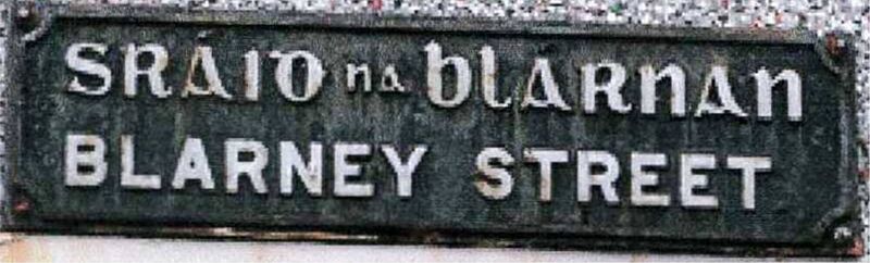 But it has only been “Blarney Street” since 1865. For centuries before that it was known as “Blarney-lane”, and further back again, on Hardiman’s map of Cork from 1602, it appears as the “Highway to Muskerry”. The change from ‘lane’ to ‘street’ was made at a meeting of the city’s “Improvement Committee” when Messrs. Lacy, Harper and Murphy complained they were finding it hard to let houses on it and requested a name change. ‘Lane’ had become synonymous with old, narrow and tending to dilapidated by then. An unsuccessful proposal was “North Castle Street”. Another matter arising at that meeting, incidentally, was the nuisance caused by bathing in the Lee on Sunday mornings opposite St. Mary’s Church, Pope’s Quay. Too close a coming together of the profane and the sacred perhaps.