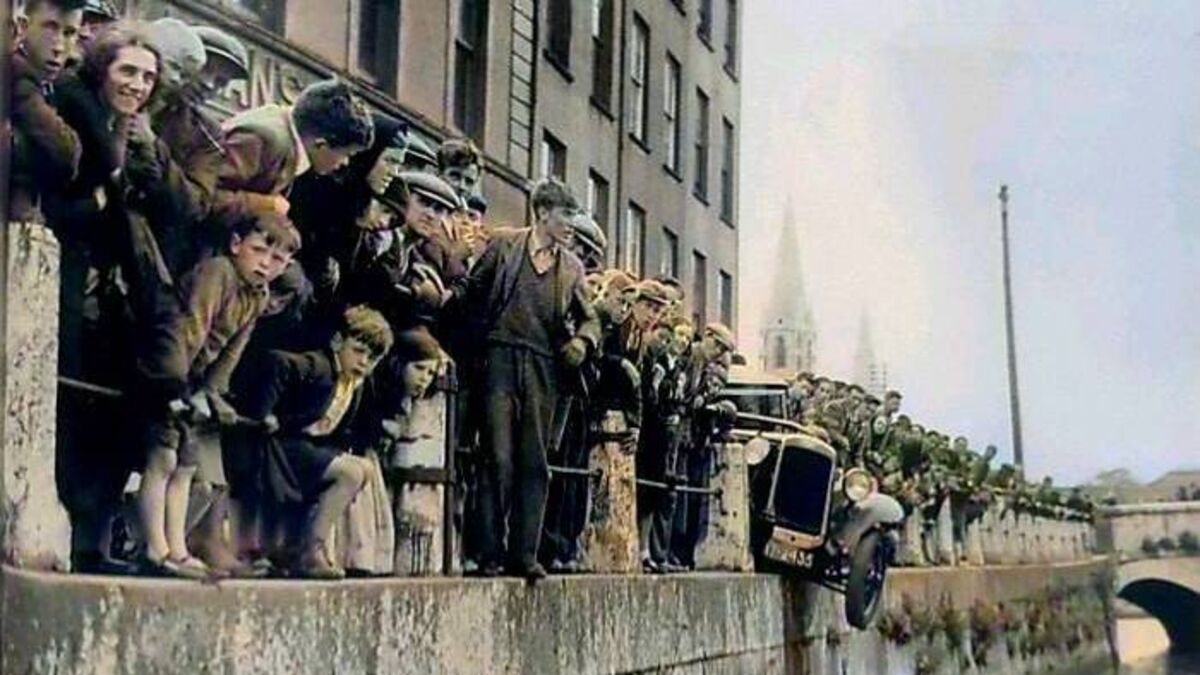 A colourised photo of the scene of the car crash on Sullivan's Quay, Cork city, on Saturday July 1, 1939, taken from a rowing boat on the Lee