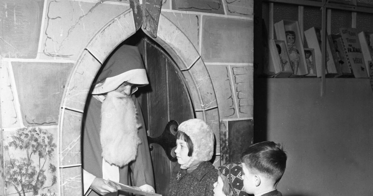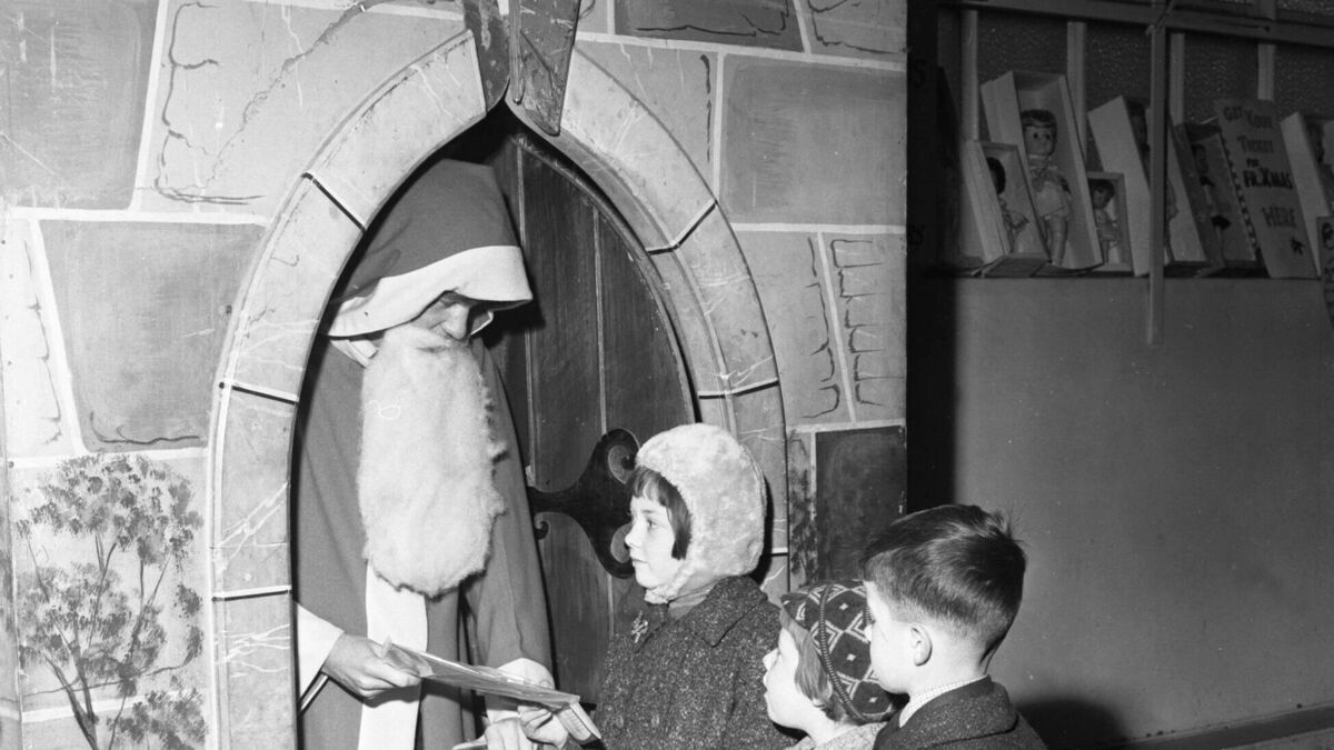 The earliest account of Santa Claus distributing presents to children in a department store in Cork dates to November, 1926, when Robertson, Ledlie, Ferguson’s department store, The Munster Arcade, advertised that ‘Father Christmas from his Villa Residence distributes to boys and girls suitable toys at a cost of 1’- each’. Within a year or two, the other large Cork shops, Grants, The Queen’s Old Castle, and Cash’s, vying for this trade, installed their own ‘toylands’, along with the parcel-gifting Santa. Roches Stores did not start its Santa campaign until the 1950s, while Dowdens, the other large outlet on Patrick Street, never had one. In the late 1920s, the Santa in Grants (beside the Mutton Lane Inn on Patrick’s Street) was installed, ‘promenading the balcony of our Patrick’s Street warehouse’, where, on paying a shilling, children could ‘walk up the steps, ring the bell and out will come Santa Claus with a lovely present’.