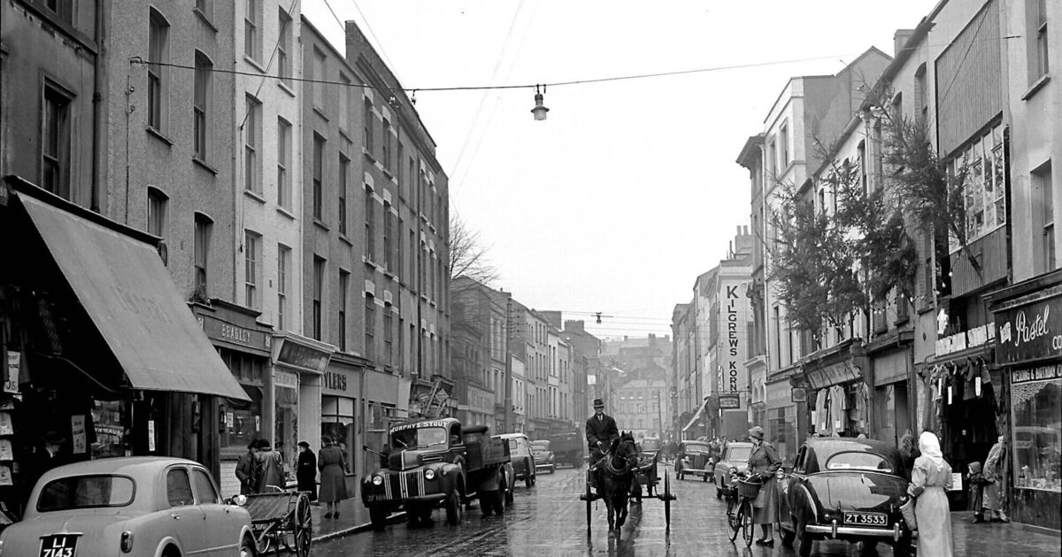 A wet North Main Street in Cork city in December,1955. Guy’s Directory from 1875 lists all the many shops that occupied the street then