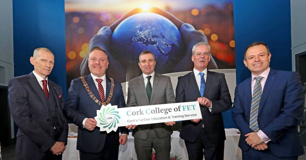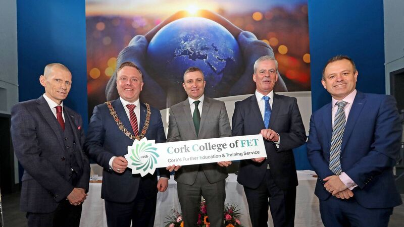 The Pathway to Your Future! Pictured at the launch of Cork College of FET were John Fitzgibbons, Director of Further Education & Training at Cork ETB, with Lord Mayor Colm Kelleher, Minister of State for Skills and Further Education Niall Collins, Denis Leamy, Chief Executive of Cork ETB, and SOLAS CEO Andrew Brownlee.