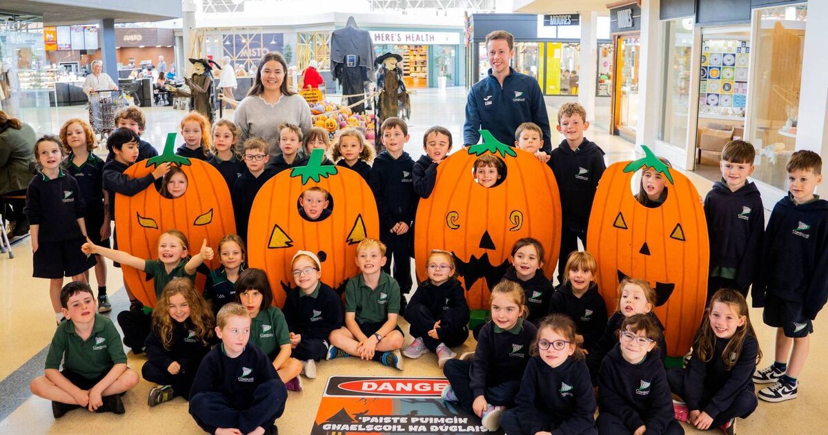 Pupils from Gaelscoil na Duglaise enjoying the fun Halloween activities at Douglas Court Shopping Centre, where people are thrilled with the community engagement and creative displays.