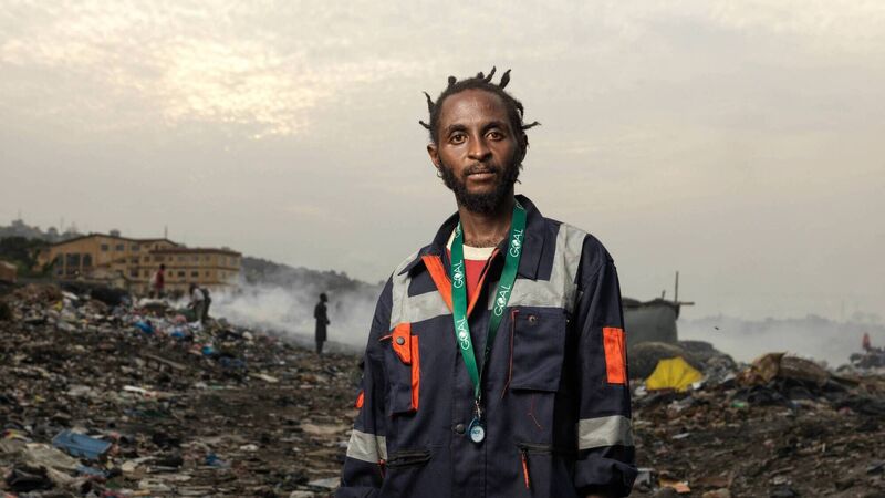 Once living and working on the Kingtom dump, Mark Korgay now helps operate Freetown’s Irish-supported waste-to-energy plant, part of a city-run system that is enabling climate action by transforming waste into renewables. Photograph: Peter Caton for GOAL Global