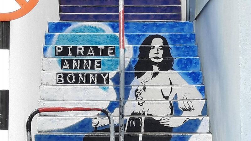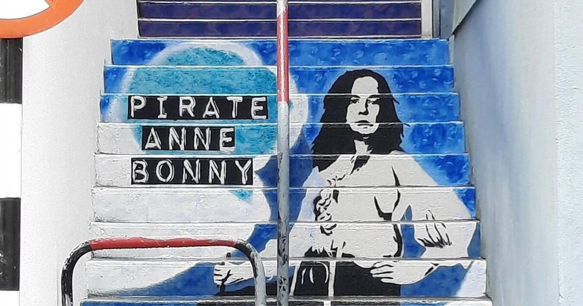 The large-scale mural celebrating legendary pirate Anne Bonny on the iconic Stoney Steps in Kinsale.