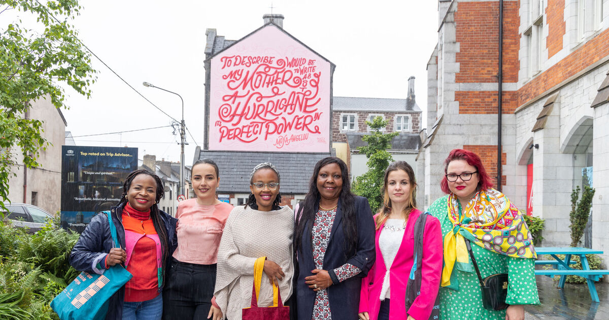 Deborah Oniah, Blerina Hysaj, Margaret Wanjiku Ndiritu, Dr Naomi Machete, Arife Hysaj and Inga Snetkova at the unveiling of Saoirse, the public art mural created, an installed, by visual artist Holly Pereira at Nano Nagle Place as part of The Mother Tongue Project. The ladies are also holding some of the beautiful tote bags designed as part of the project. Picture: Darragh Kane