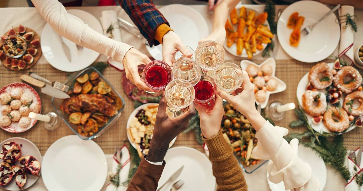 Top view background of people raising glasses over festive dinner table while celebrating Christmas with friends and family, copy space