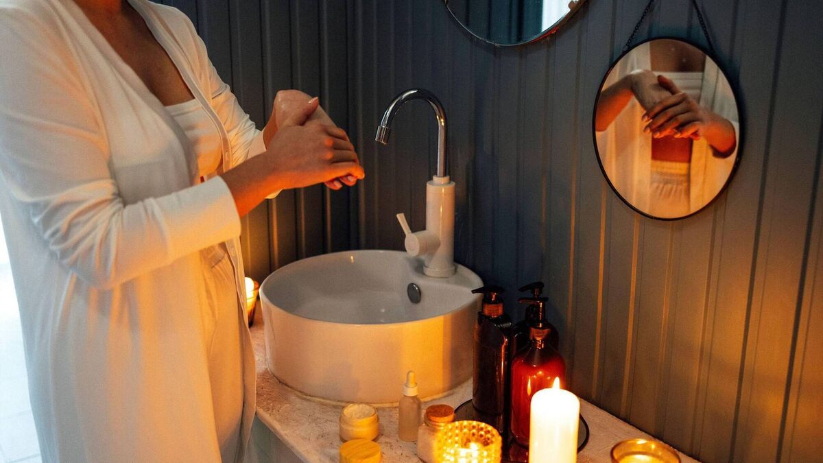 “I recommend dedicating your bathroom countertop space to decorative items, such as aromatherapy essential oils or scented candles, with calming scents like lavender, chamomile or eucalyptus.”