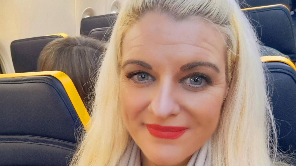 Emer O'Callaghan on a recent flight wearing a top from Dunnes Stores and cashmere scarf was a gift. Emer's make-up is Master Colors Paris available from Emerald Beauty Clinic
